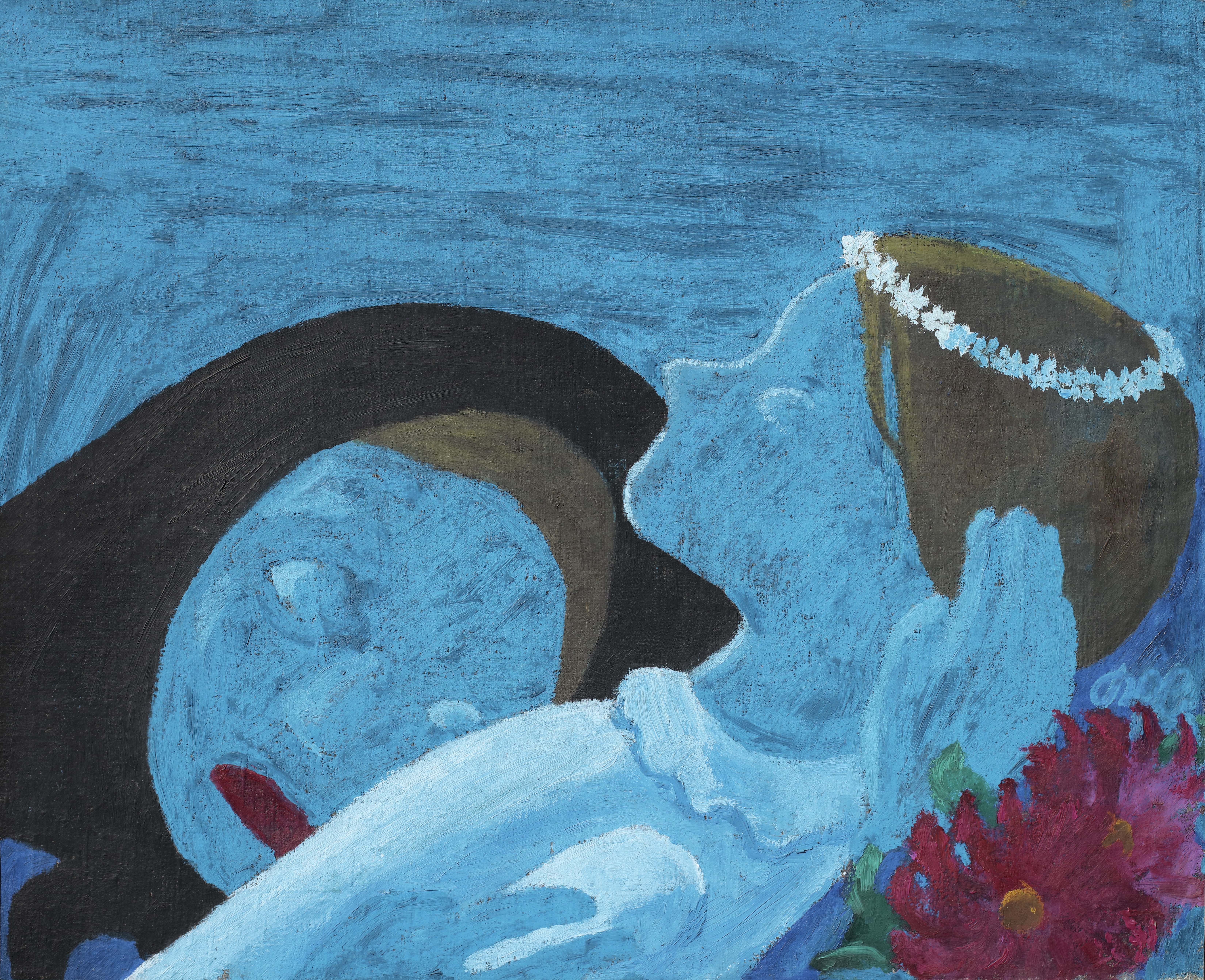 „Das Bild ist auf einen Blau-Rot-Kontrast aufgebaut. Mutter und Kind haben das gleiche fahlgelbe Haar; das Grün der Blumenblätter und das Violett des Kleides der Mutter vermitteln die Kontraste: erst das ist Malerei. Blau – das ist die Unendlichkeit, die Sehnsucht nach einem glücklichen Jenseits, das Leben und Tod zusammenfasst, das der Mutter Anteil am toten Kind gewährt, es ist das Jenseits, das auch die Mutter aufnehmen wird. Das Gesicht des Kindes ist mit einem weißen Kontur umrissen. Weiß – farblos wie der Tod – sind auch die Augen der Mutter, das geschlossene Lid des Kindes, der Jungfernkranz und die Modellierung des Totenhemdes: das Leben ist ausgelöscht, Weiß ist die Farbe der Reinheit des Kindes, es verklärt den Tod. Das Weiß in den Augen der Mutter ist blau gebrochen, es hat einen Schimmer von Leben, in dem sich das Jenseits spiegelt. Der Mund der Mutter ist rot, ist Leben, das Kind ist mundlos, ist tot“, schreibt Heimo Kuchling.