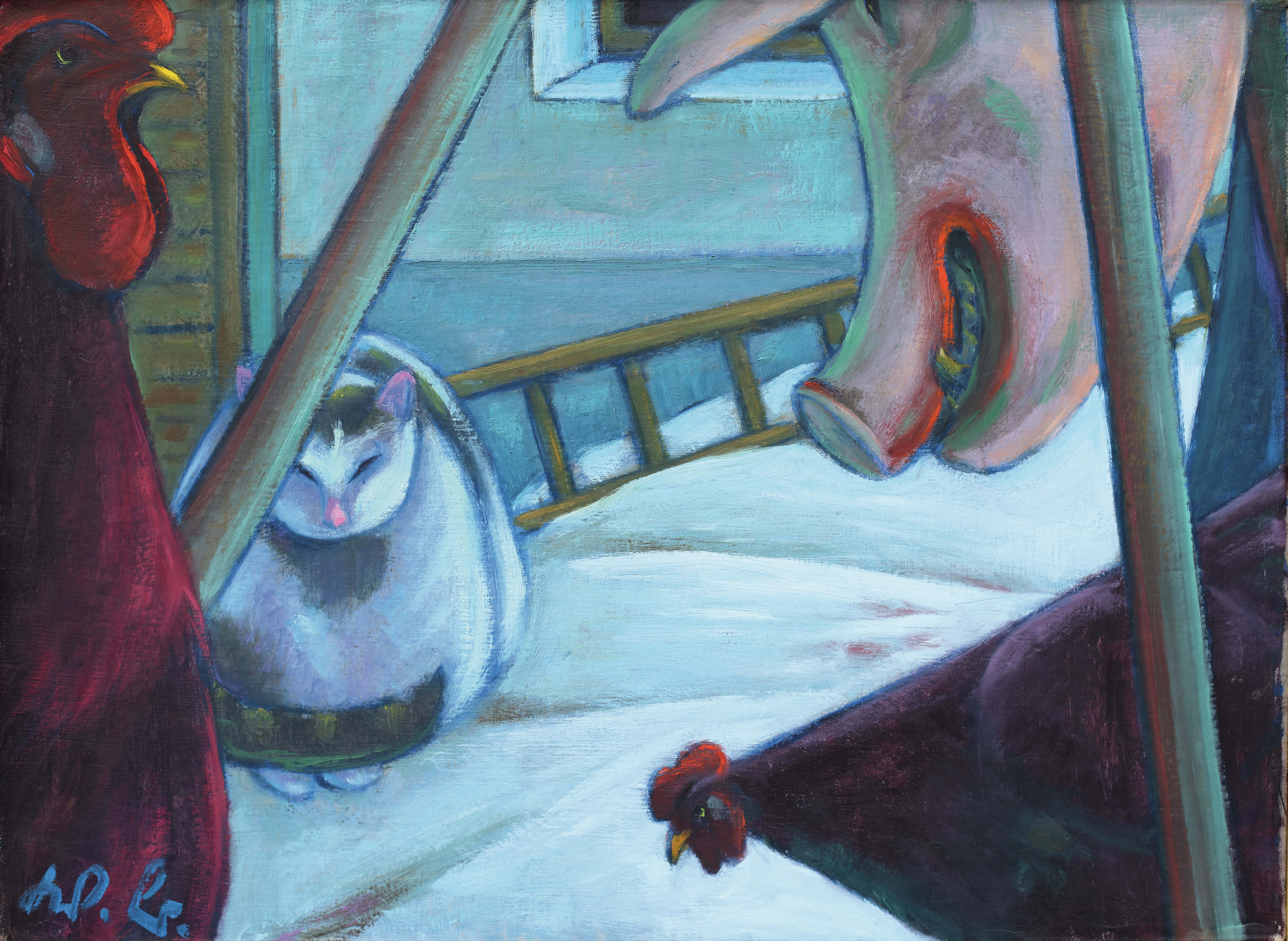 Dieses Bild zeigt im kleinen Ausschnitt und in strengster formaler Behandlung das bäuerliche Welttheater. Der Saukopf hängt am Schragen von oben in das Bild, darunter die unbeteiligte Teilnahmslosigkeit darstellende, nach Futter pickende Henne. Wie das in sich zusammengekauerte schlechte Gewissen hockt die Katze, die Augen vor dem Grauen schließen wollend. Aufrecht und selbstherrlich – ein Richter, dem kein Leid nahe geht – beschließt der Hahn den rechten Bildrand. Sein Kamm ist wie ein herrschaftlicher Talar gefärbt, das grelle Rot des triefenden Blutes des getöteten Tieres wird hier noch einmal aufgenommen und zum purpurnen Zeichen der unbeeinflussbaren Macht. „Ecce Mundo – so ist die Welt“ scheint dieses Bild in Erinnerung des „Ecce Homo“ zu sagen.