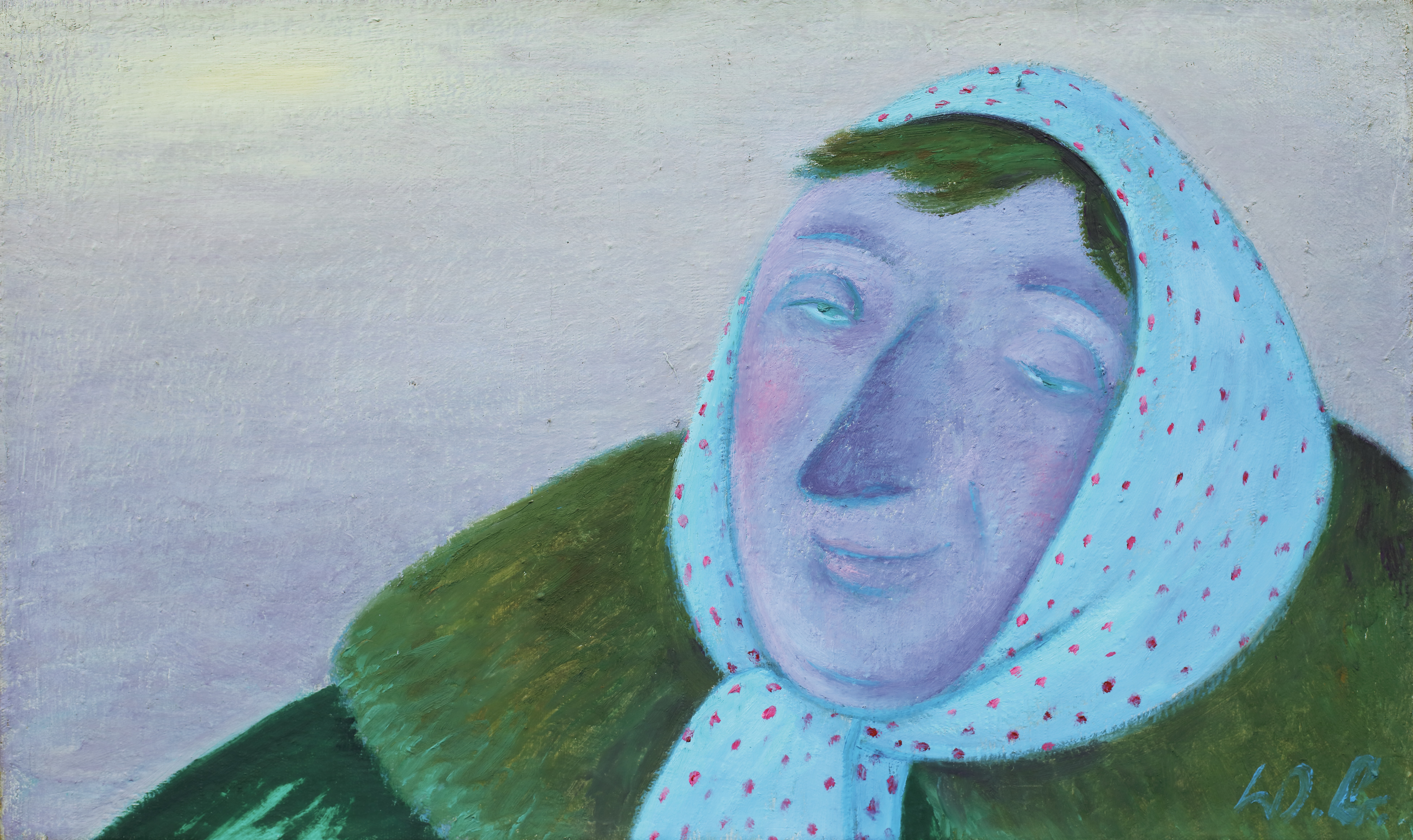 Eine Frau mit Kopftuch und Pelzkragen ist an einem kalten Jännermorgen unterwegs. Das Rot des morgendlichen Winternebels ist auch in den vom Frost geröteten Wangen der Frau und in den roten Punkten des Kopftuches wiederzufinden. Das schielende Auge ist schwachsichtig nach oben gedreht, aus dem anderen blickt sie den Betrachter in zufriedener Schläue lächelnd an.